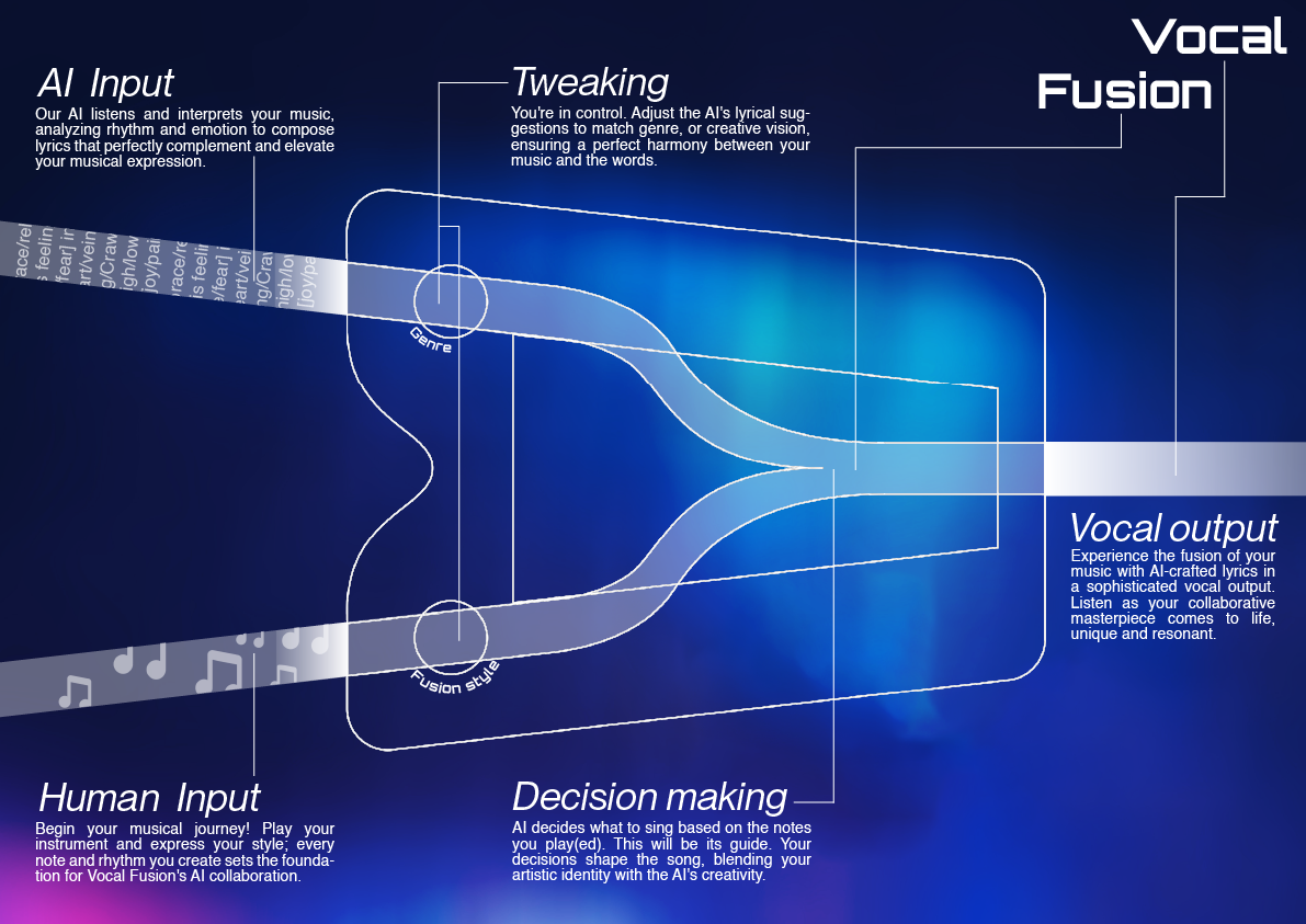 Vocal Fusion introduces a unique concept in musical creation: an equitable, real-time collaboration between human musicians and artificial intelligence. This interface stands apart by enabling a two-way conversation, where both human creativity and AI capabilities are given equal importance. Instead of simply executing pre-defined commands, the AI in Vocal Fusion listens, adapts, and thoughtfully responds, generating lyrics that harmonize with the user's melody and playing intensity.